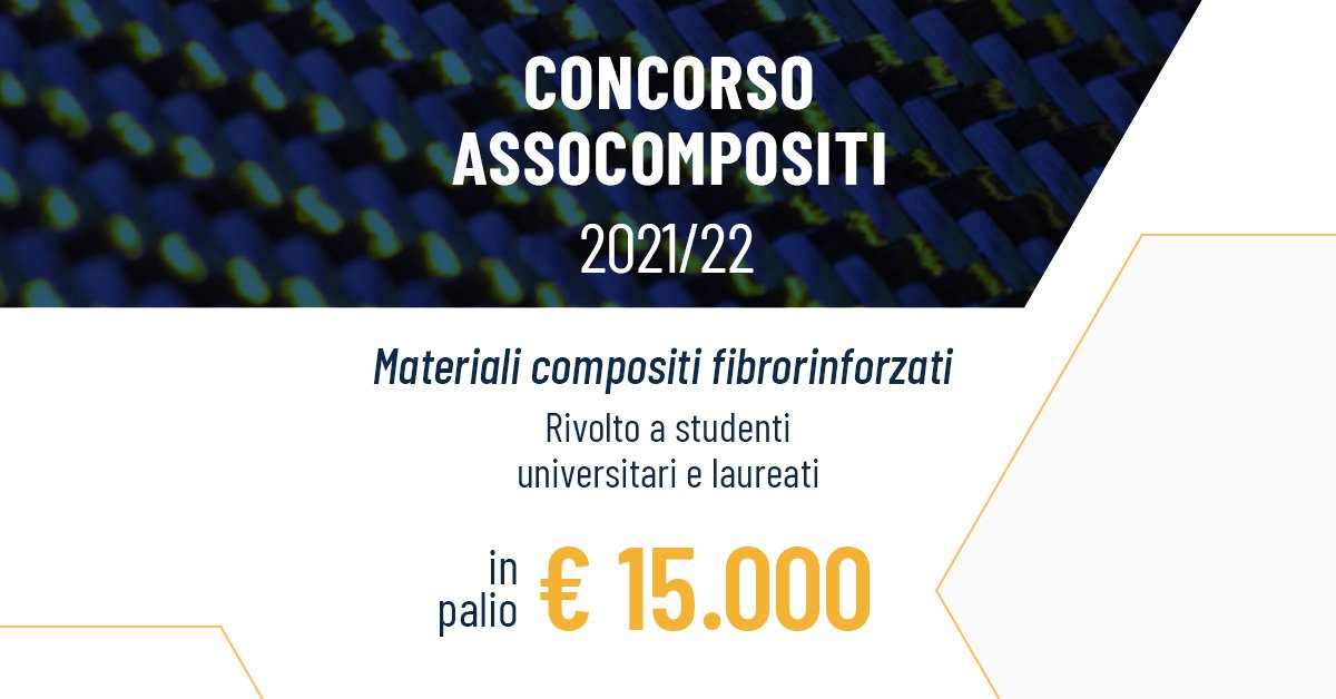 Si è chiuso il 31/01/2022 il bando Assocompositi per un concorso nazionale dedicato a sviluppare ed approfondire tematiche connesse al settore dei materiali compositi fibrorinforzati. Il Concorso è destinato a studenti o team di studenti (dottorandi compresi) regolarmente iscritti a Università italiane o laureati in data non antecedente al 2020. Ulteriori informazioni su vincitori e premiazione verranno diffusi su questo sito entro marzo 2022.